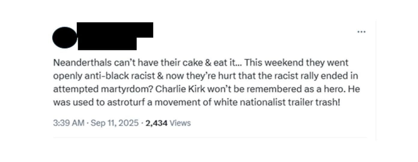 A South African national said that Kirk’s mourners are “hurt that the racist rally ended in attempted martyrdom” and alleged that “he was used to astroturf a movement of white nationalist trailer trash.”