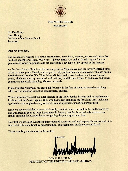 President Trump knows something about bogus, politically-motivated prosecutions, so he sympathizes with Benjamin Netanyahu, who is going through the same thing Trump did. So Trump wrote a letter to Israeli President Isaac Herzog, asking him to pardon Netanyahu. The letter is embedded below.