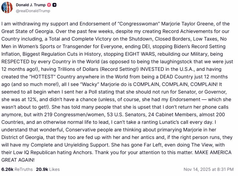 “I understand that wonderful, Conservative people are thinking about primarying Marjorie in her District of Georgia, that they too are fed up with her and her antics and, if the right person runs, they will have my Complete and Unyielding Support,” the president added.