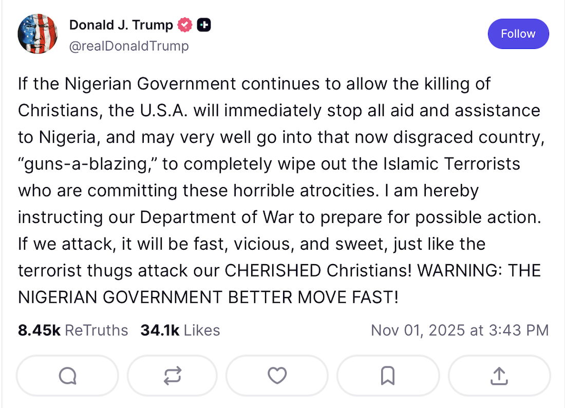 I don’t expect we will see the 82nd Airborne deployed to Nigeria, but a pause in foreign aid payments could well be in the offing. Nigeria’s government had this response, after being put on the “Countries of Particular Concern”–i.e., regarding religious freedom–list: