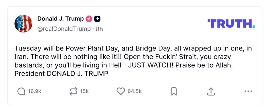 Separately, Trump told reporters that he continues to negotiate with Iranian officials in advance of the Tuesday deadline. “There is a good chance, but if they don’t make a deal, I am blowing up everything over there,” Trump told Axios. In an interview with The Wall Street Journal, Trump said Iran would “lose every power plant” in Tuesday’s strikes.