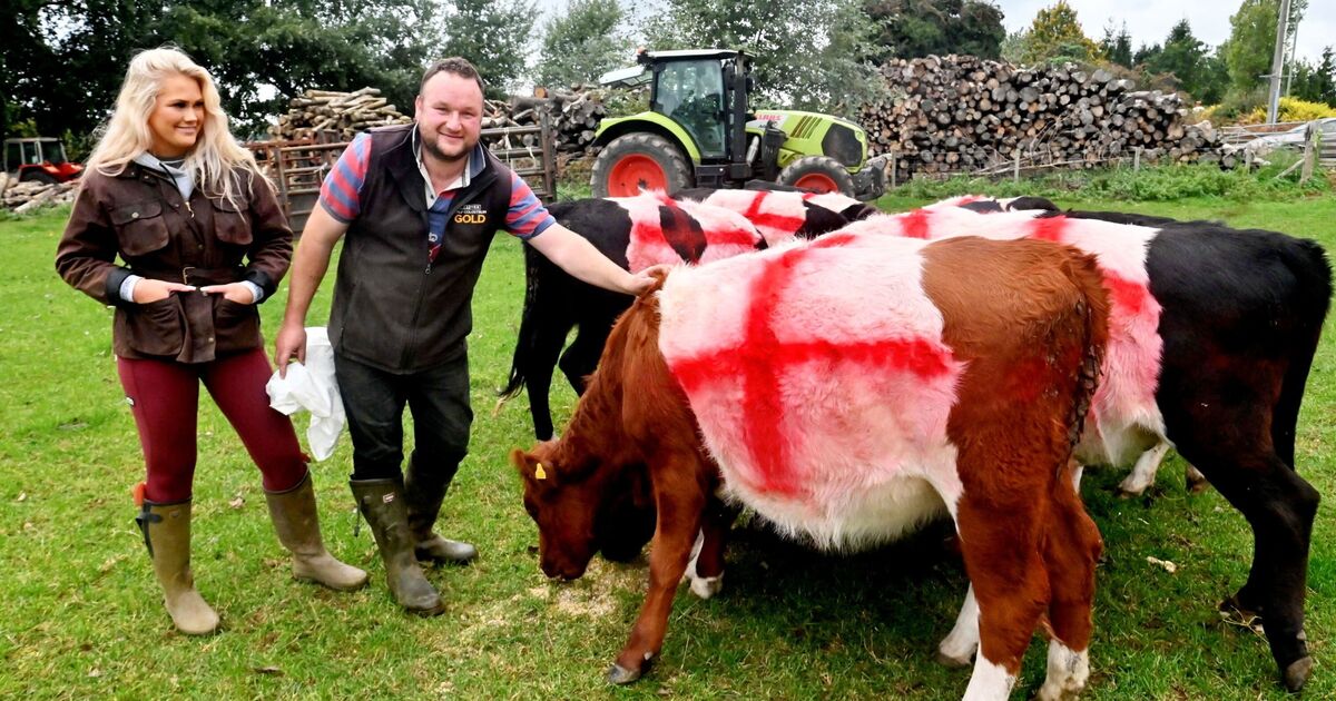 Two farmers are flying the flag for the agricultural industry after painting the St George’s Cross on their herd of COWS. Ed Bunning, 30, and Sarah Mottershead, 26, sprayed the red England flag on their cattle at their farm near Bridgnorth, Shropshire.