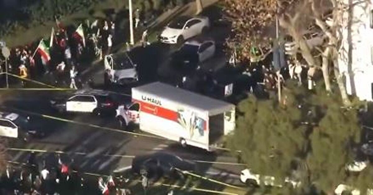 A U-Haul truck was filmed moving through a group of protesters, with footage showing people scattering as the vehicle pushed forward. Witnesses said the driver accelerated toward demonstrators waving Iranian flags and appeared to try to force his way through the protest.