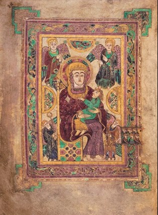The elements of knotwork, interlacing, zigzags, and rich colouring, as well as the hieratic pose of the saints, are common to both. Might this explain the pose of the Virgin and Child (f.7r), said to be the earliest image of the Virgin in a Western manuscript? Archaeological evidence shows that Coptic monks lie buried in Ulster, and there is literary evidence that guidebooks to the Holy Land and Egypt were available to Irish monks.