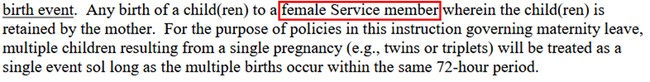 In addition, the previous version (.PFD) of the Defense Department’s leave instruction did not contain a single reference to “non-birth” parents. It referred to birthing as an event exclusive to women.
