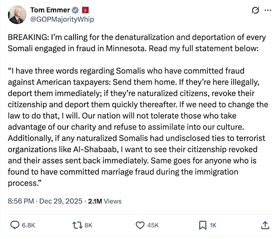 Meanwhile, House Whip Tom Emmer, who represents Minnesota’s 6th Congressional District, has come out for denaturalization and deportation: