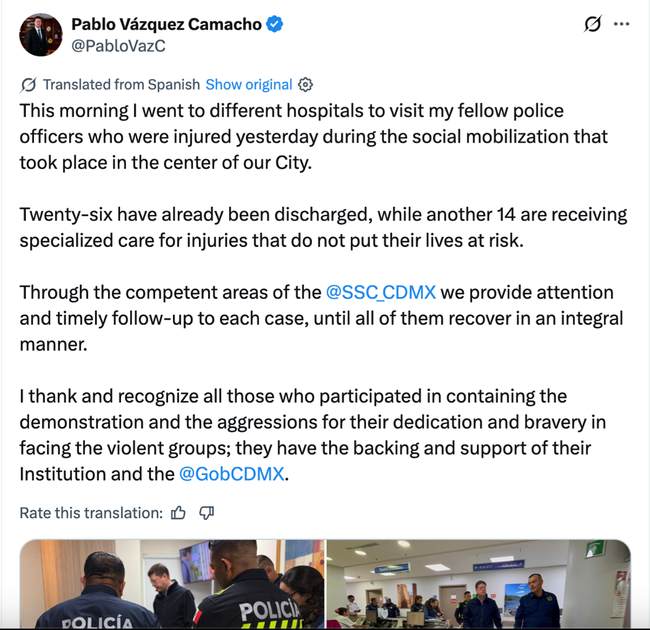 The Secretariat of Citizen Security of Mexico City announced via social media that at least 60 police officers had minor injuries, and 40 officers were taken to hospitals.