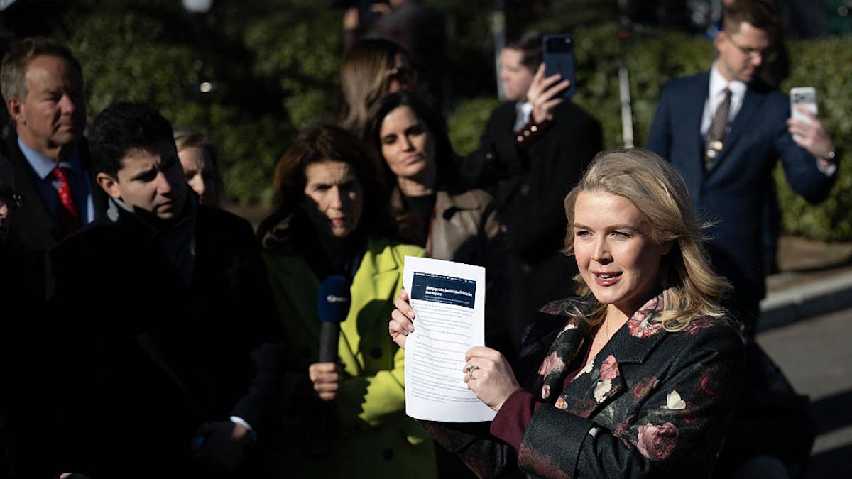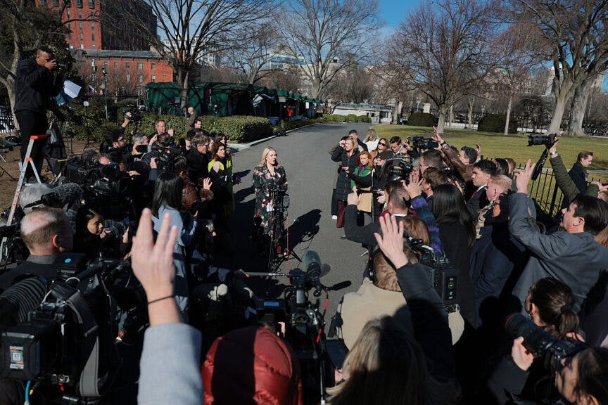 WASHINGTON, DC – JANUARY 12: U.S. White House Press Secretary Karoline Leavitt speaks to reporters outside of the West Wing of the White House on January 12, 2026, in Washington, DC. (Photo by Anna Moneymaker/Getty Images)