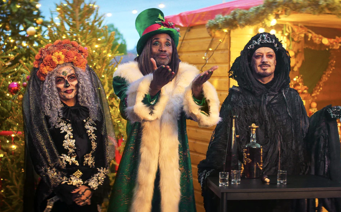 Of course three spirits arrive to show him the error of his ways, heralded by Sood’s late partner Marley, who takes the genuinely blood-curdling form of a CGI Hugh Bonneville. The casting here baffles relentlessly: the ghosts are played respectively by Eva Longoria (in inexplicable Day of the Dead make-up that renders her unrecognisable), the Broadway star Billy Porter and Boy George – whose bulky black shroud, when shot on the pavement in broad daylight, makes him look like he’s been left out for the bin men.