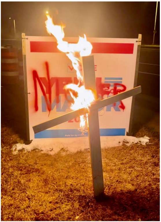 During the election, supporters of CANDIDATE 1 placed a campaign sign encouraging others to vote for CANDIDATE 1 in a grassy area on the northwest corner of the intersection of North Union Boulevard and East Fillmore Street, two of Colorado Springs’s major traffic arteries. On or about April 23, 2023, between approximately 2:30 a.m. and 3:30 a.m. BERNARD, BLACKCLOUD, and WEST worked together to place a wooden cross in front of that campaign sign. Red spray paint, similar in kind to a can later found in the passenger compartment of BLACKCLOUD’s car, was used to write the word “nigger” on the sign. The wooden cross was then set on fire….